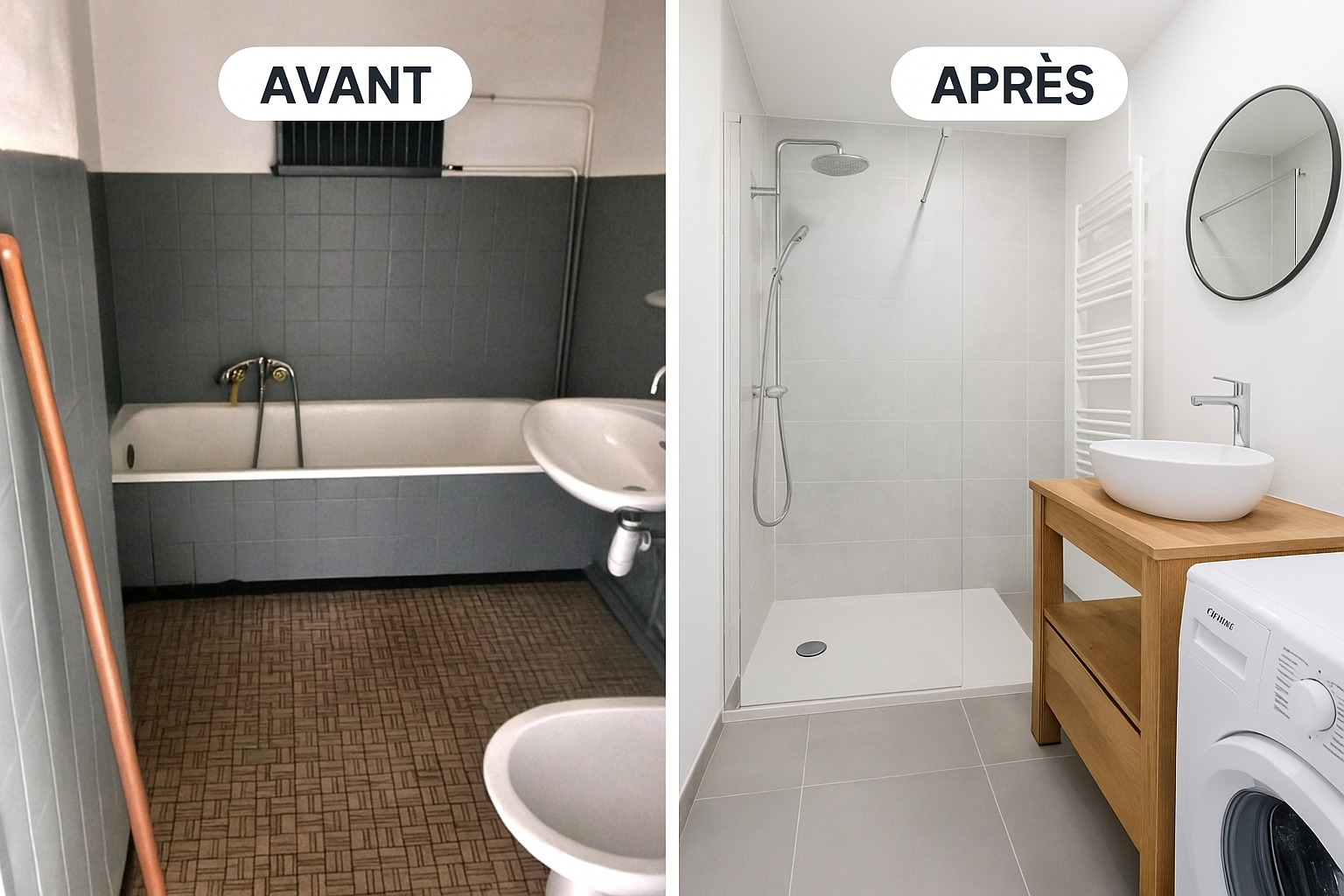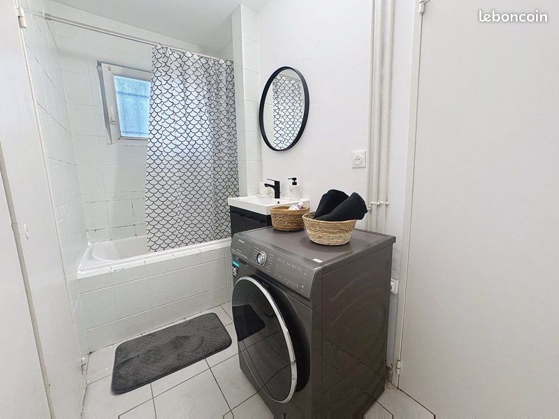 - Une salle de bain avec baignoire, vasque et machine à laver